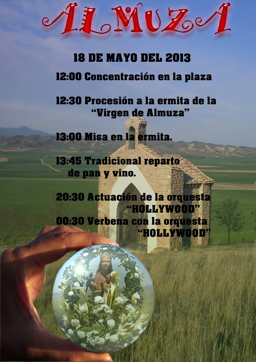 A las 12:30h, comenzará la procesión a la ermita de la Virgen de Almuza. A continuación, celebración de la misa. La imagen de la virgen, presidirá la ceremonia.