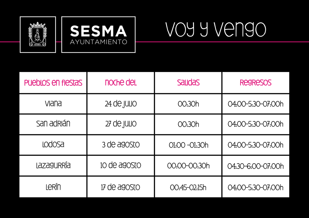 Un año más, se ha puesto en marcha una nueva edición del servicio de autobús nocturno "Voy y vengo", cuyo fin es prevenir accidentes de tráfico entre jóvenes que se desplazan a las fiestas de las localidades cercanas a Sesma.