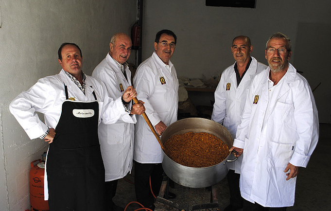Los ingredientes que utilizaron este año, tal y como afirmaban los cocineros entre los fogones, fueron 135 kilos de pan picado, 38 de picadillo de chorizo, 16 de panceta, 6 de ajos, 24 litros de aceite, 45 de agua y tomate.