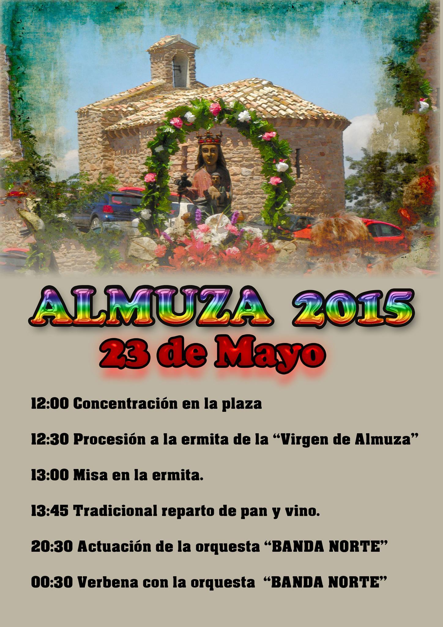 A las 12:30h, comenzará la procesión a la ermita de la Virgen de Almuza. A continuación, 13:00h, celebración de la misa. La imagen de la virgen, presidirá la ceremonia.