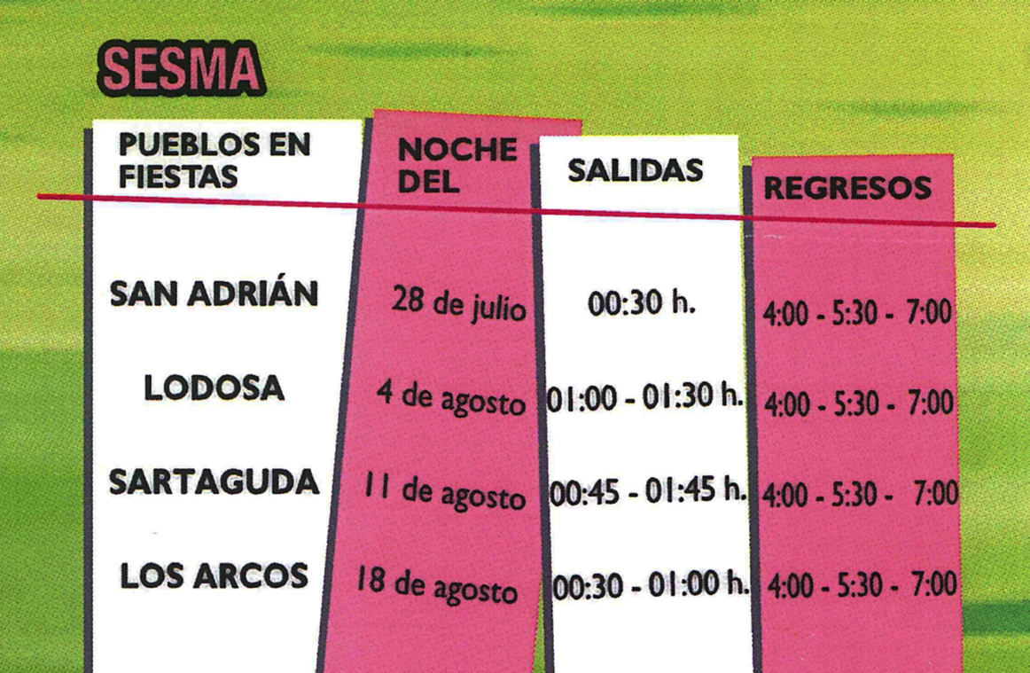 Un año más, se ha puesto en marcha una nueva edición del servicio de autobús nocturno "Voy y vengo", cuyo fin es prevenir accidentes de tráfico entre jóvenes que se desplazan a las fiestas de las localidades cercanas a Sesma.